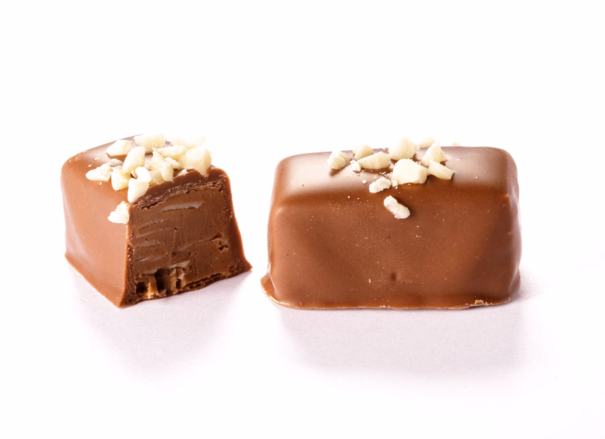 Nougat med flagad mandel doppad i ljus 36% choklad.