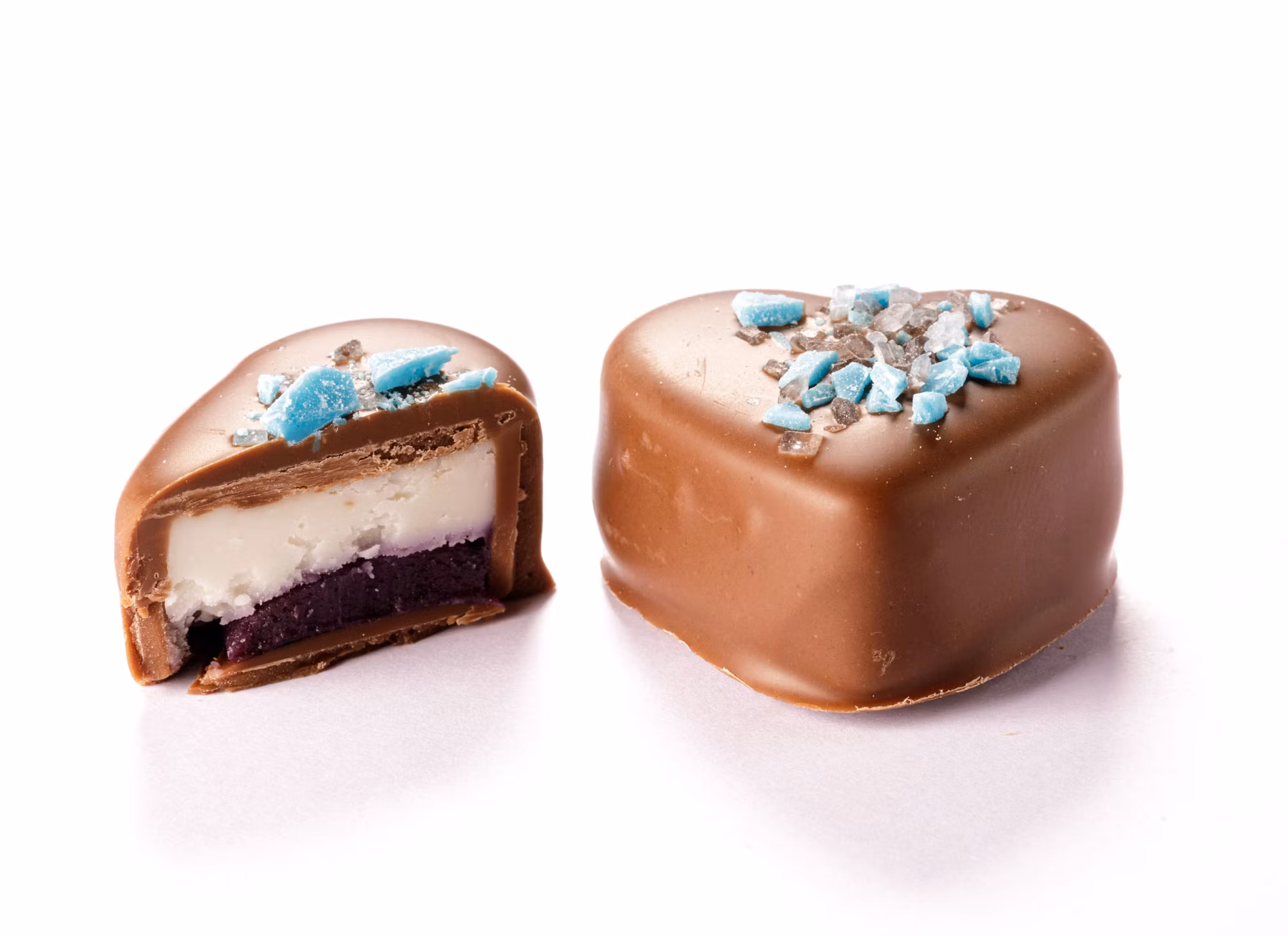 Vit tryffel samt en blåbärscreme smaksatt med Ruby choklad doppad i ljus 36% choklad.