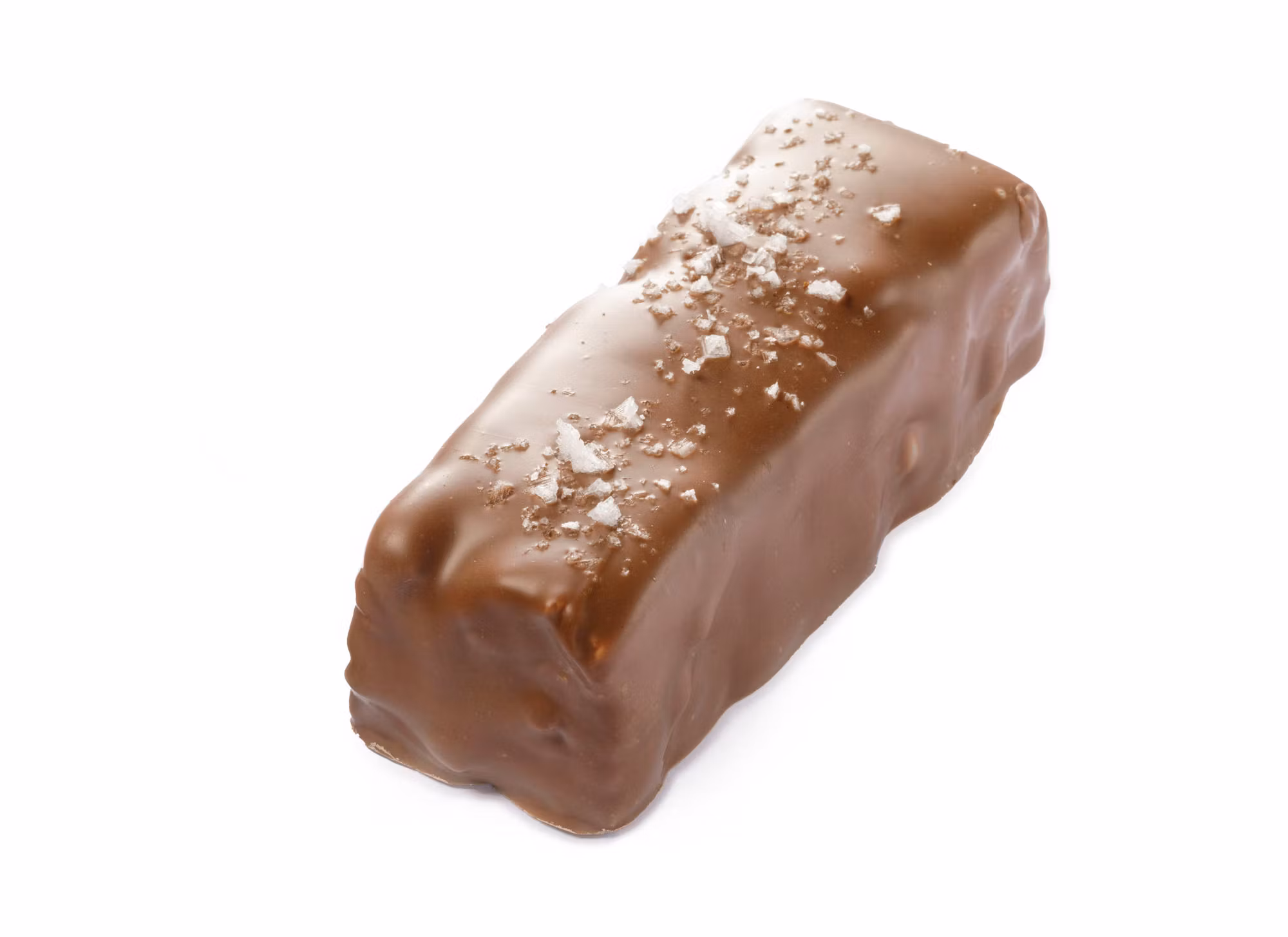 Vit hård seg nougat med nötter och smak av salted caramel doppad i ljus 36% choklad. Obs! Innehåller ägg och spår av jordnötter. (ca 70g)